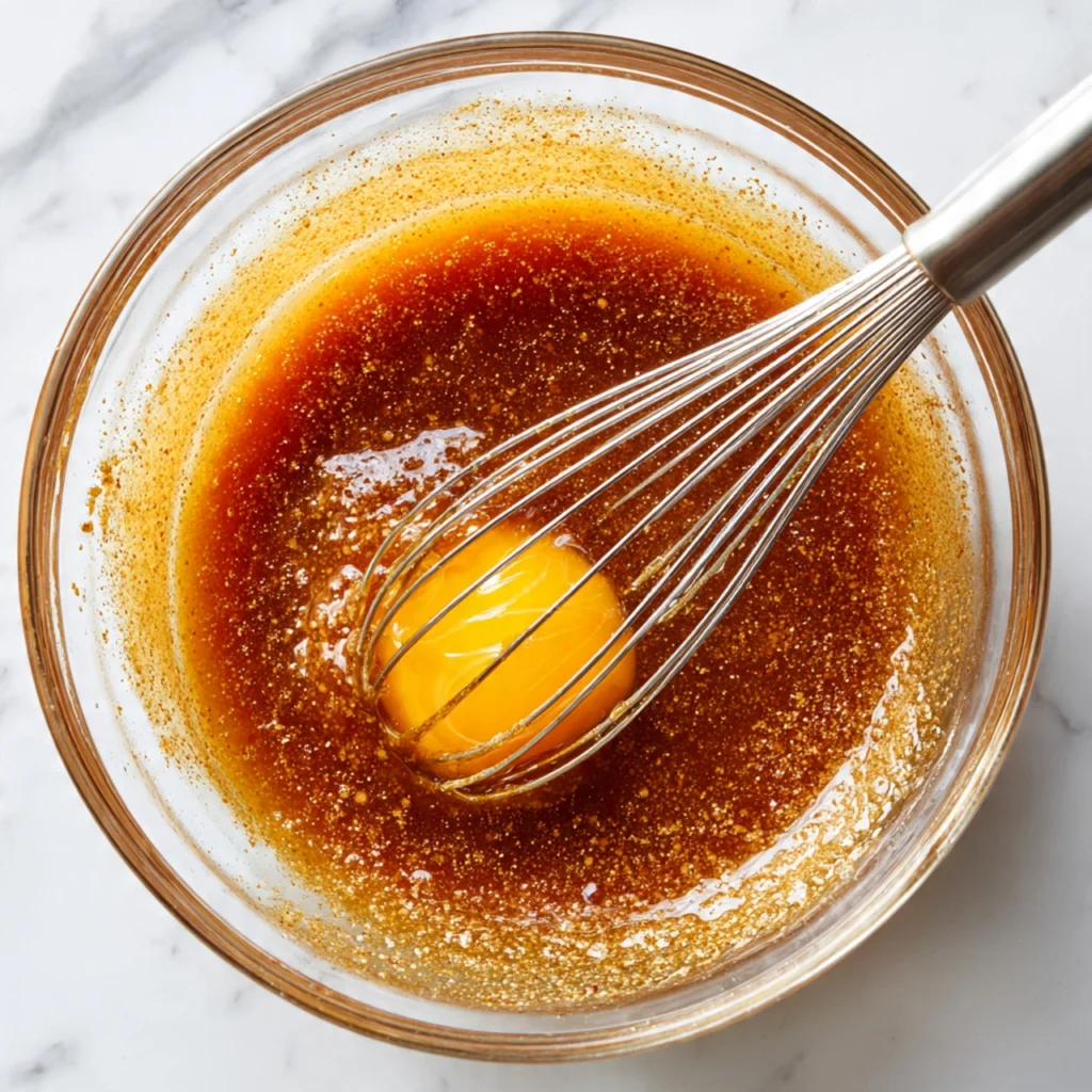 Add both the light brown sugar and granulated sugar to the warm browned butter. Whisk vigorously for about 90 seconds until the sugars are completely combined with the butter and the mixture looks smooth, glossy, and slightly thickened. The mixture will not be silky smooth at this point — some graininess from undissolved sugar crystals is normal and expected.